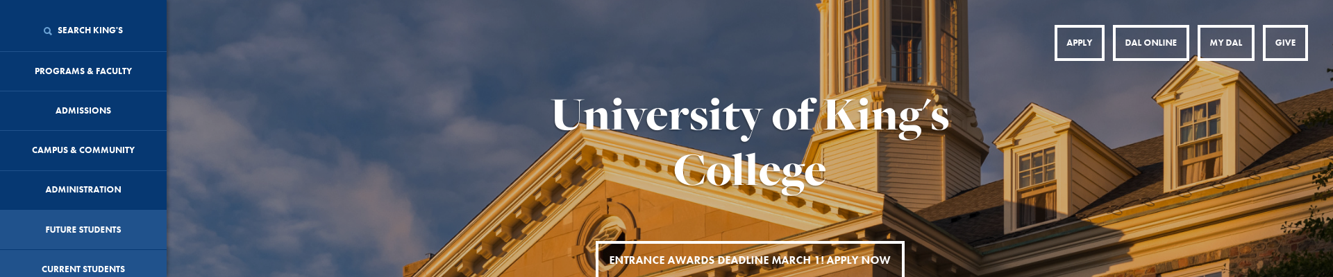 Founded in 1789 by Royal Charter, The University of King's College is one of Canada??"s oldest universities. Currently, it is located in Halifax, Nova Scotia and has approximately 800 students including both undergraduates and graduates. It offers a diverse range of programming in the humanities, social sciences, and sciences.