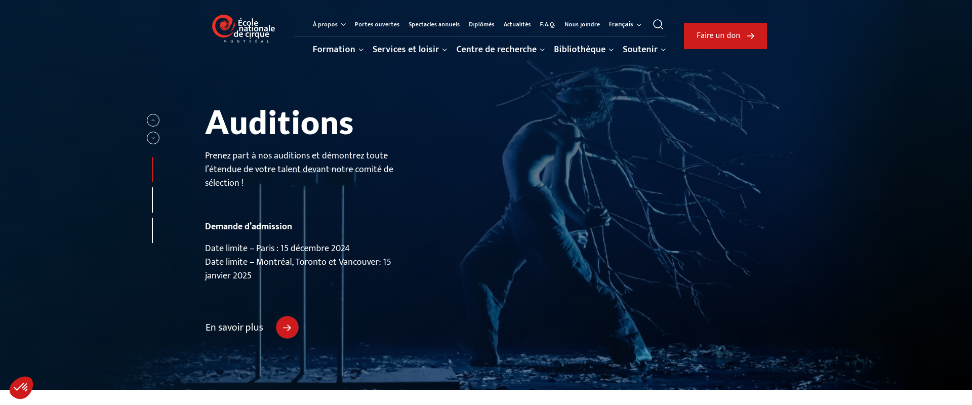 Located in Montreal, Quebec, ???cole Nationale de Cirque (also known as ??SCirque School?) is a unique higher education institution that specializes in teaching the world of circus arts. Founded in 1989, it is Canada??"s only free-standing professional training institution for circus arts, offering programs focused on training students to become world-class circus professionals. Offering both graduate and undergraduate courses, the school provides a vibrant and enriching educational environment designed to offer students an unparalleled experience in learning and performing.