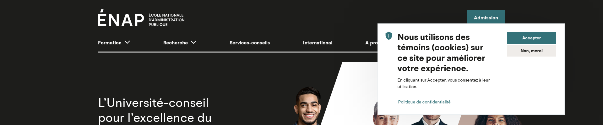 The Universit� du Qu�bec ?? ?0cole nationale d'administration publique (ENAP) is a public university in Quebec, Canada and is a member of the Universit� du Qu�bec network. Its Campus is located in the Montmorency borough of Laval, about 9 km north of Montreal. ENAP offers a wide variety of graduate and postgraduate degree programs geared towards public administration and policy, and is one of the few universities in Canada that specialize in these disciplines.