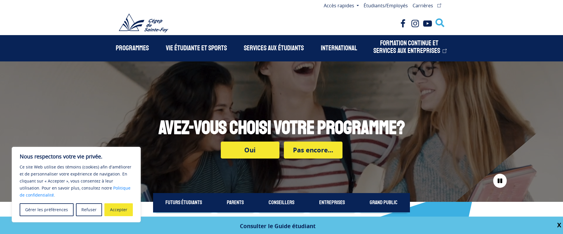Collège d'enseignement général et professionnel (CéGEP) de Sainte-Foy, founded in 1967, is located in Quebec City, Canada. With a student population of over 5000, CéGEP de Sainte-Foy provides comprehensive studies in both general and professional education, in both French and English, to both high school and college level students. Courses cover a range of disciplines, from the humanities to certain technical and business programs. CéGEP de Sainte-Foy also offers adult education and commercial training to those looking to continue their education or to acquire additional skills. In addition, CéGEP de Sainte-Foy has well-equipped and modern laboratories, as well as an extensive library and media resource centre.